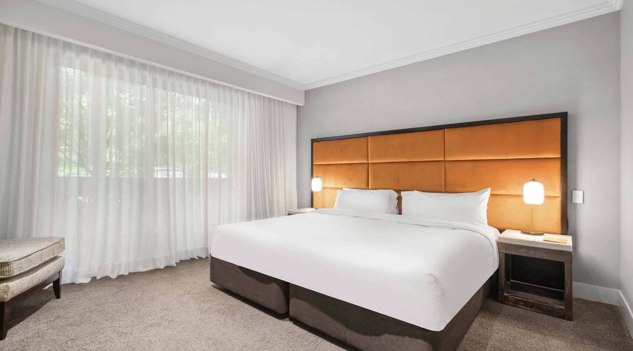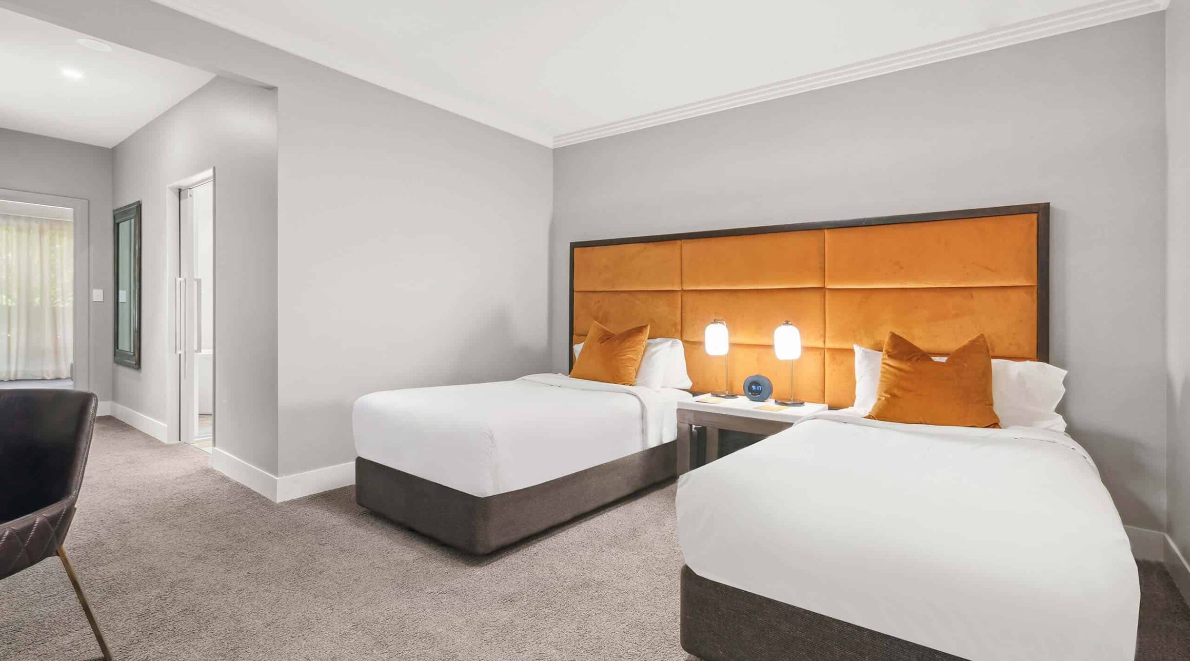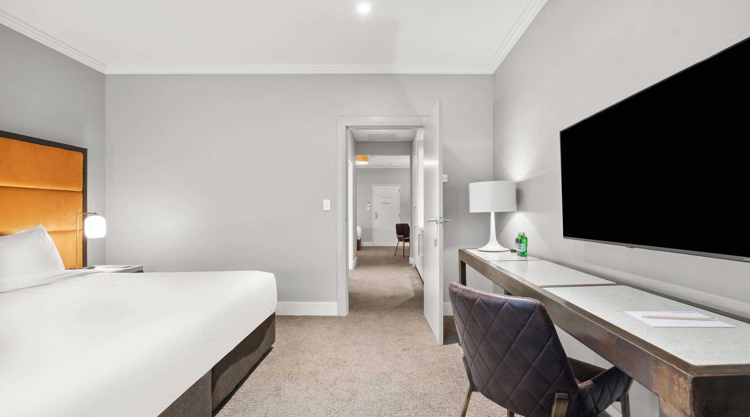 A large 55 sqm and well-appointed family room featuring a Continental King bed and two King single beds. The room features a luxurious marble bathroom with a freestanding bath and walk-in shower, two televisions, and a floor-to-ceiling window wall with a private balcony. The Highlands Family Room interconnects with the Centennial Accessible, subject to availability.
